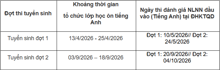 Thí sinh chưa đủ điều kiện ngoại ngữ đầu vào theo quy định có thể đăng ký tham dự kỳ đánh giá năng lực ngoại ngữ (tiếng Anh) đầu vào do ĐHKTQD tổ chức.